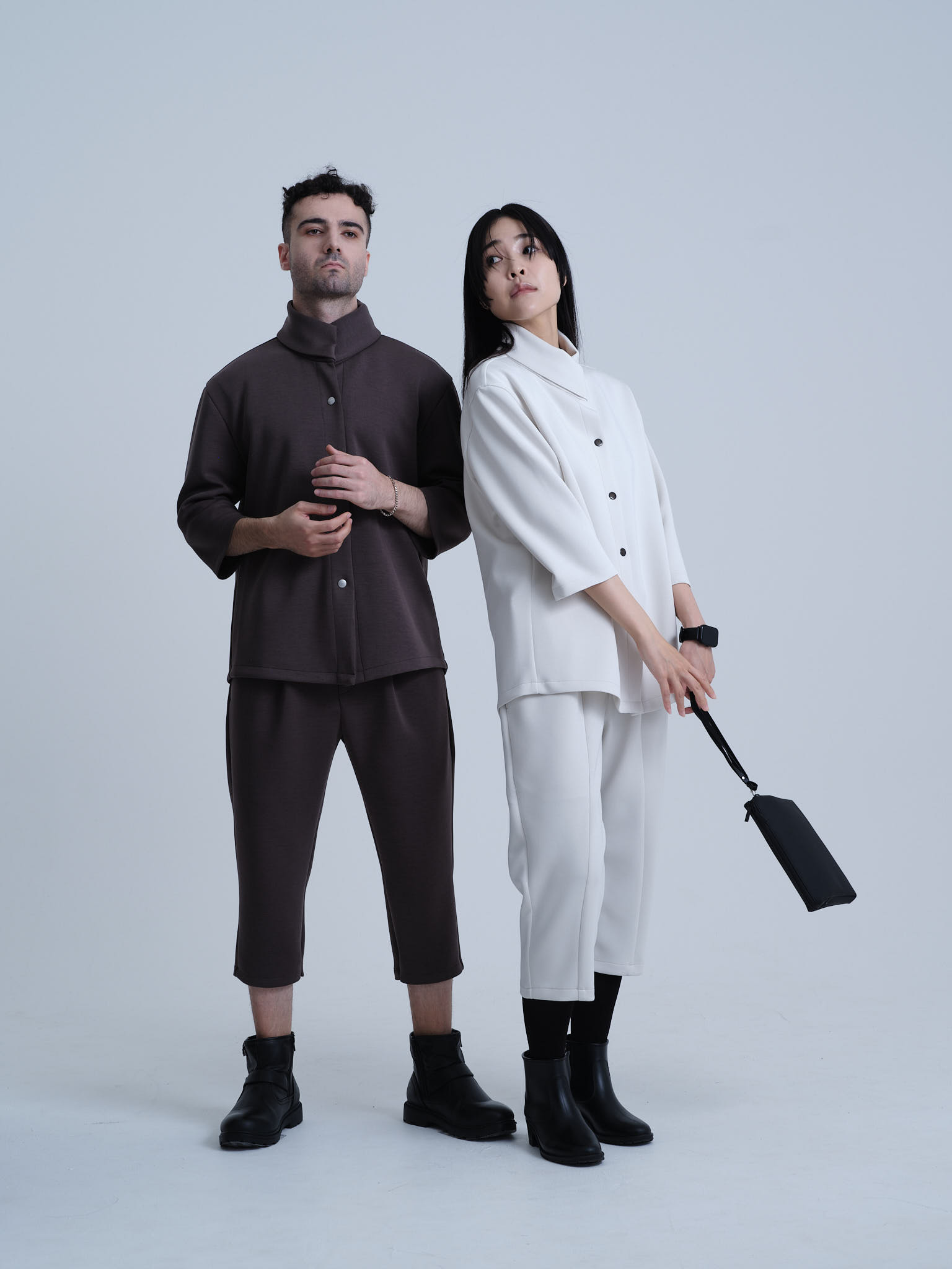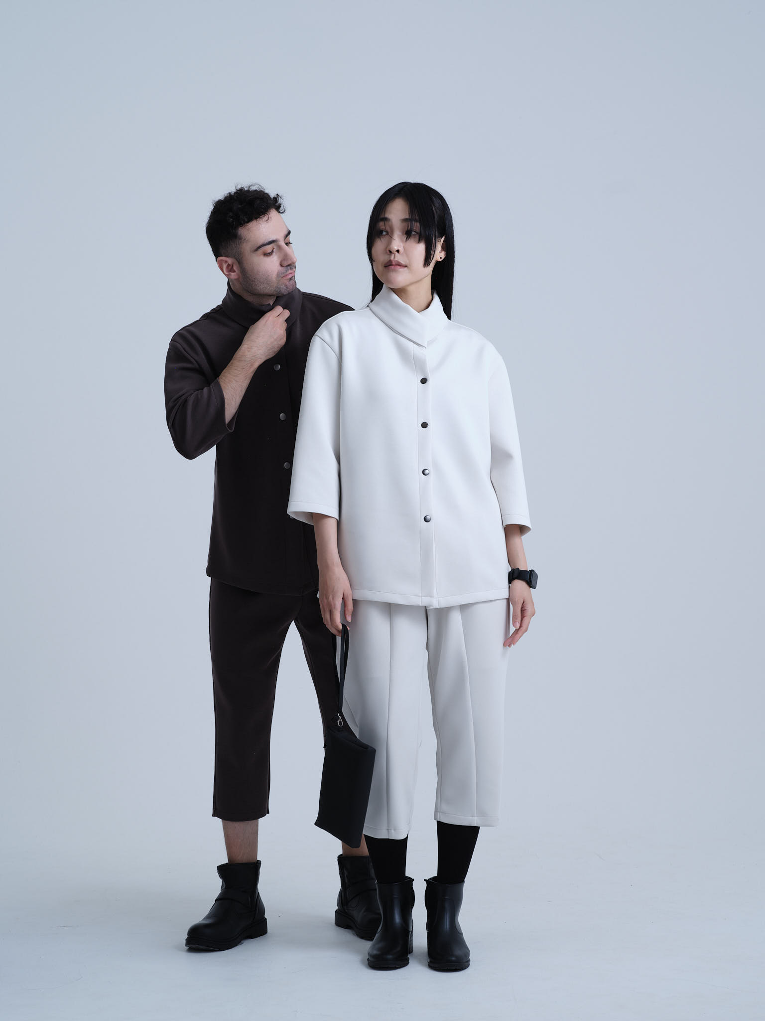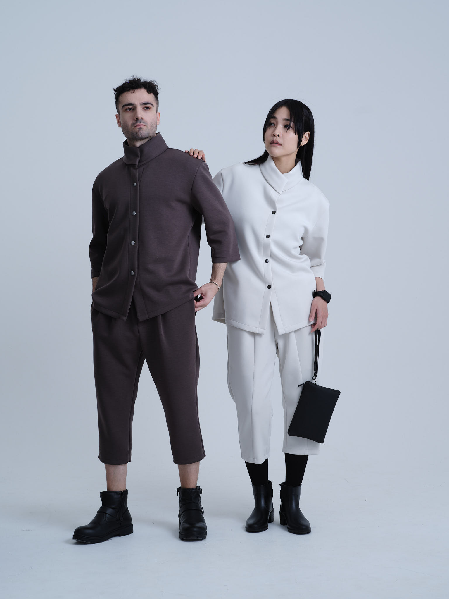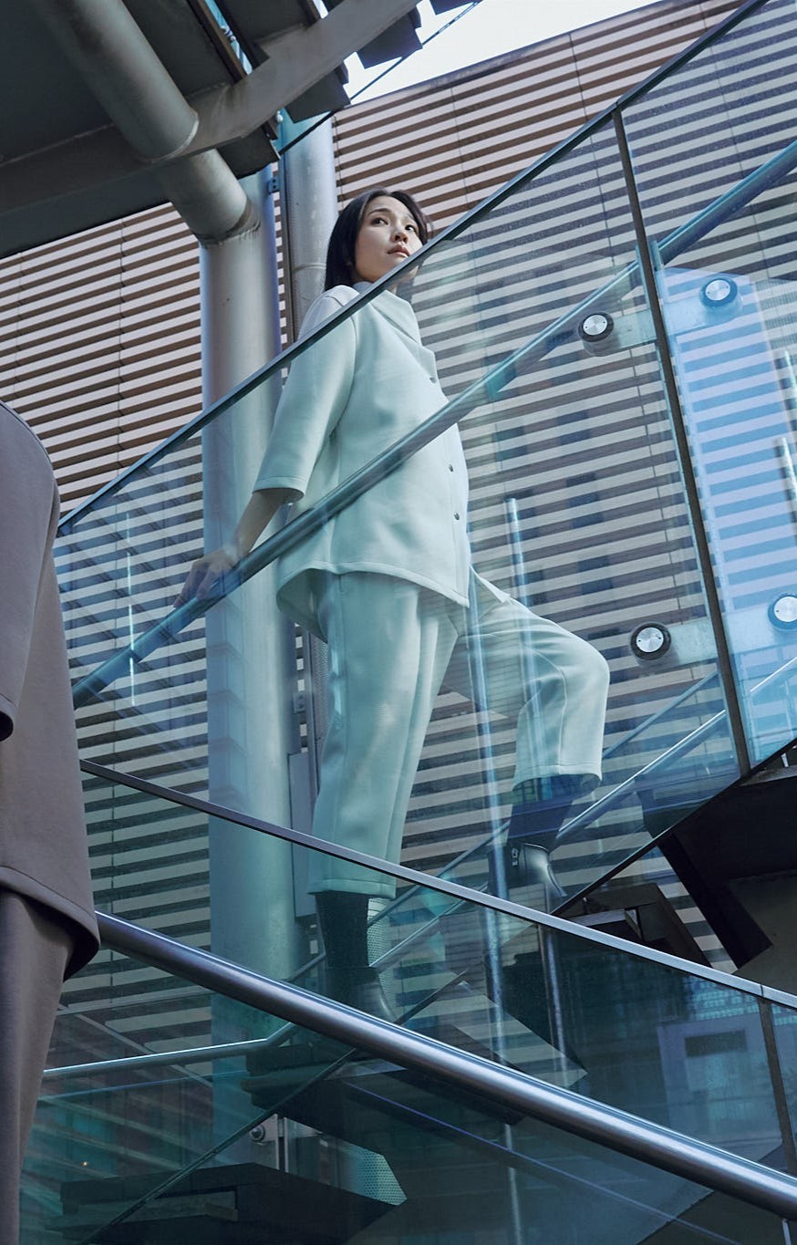 欧州のテーラリングと日本のミニマリズムを融合させた、クリエイターのためのハイブリッド・セットアップ。マグネットで瞬時に固定されるハイネックカーディガンと、自由な動きを可能にする半キュロット。オフィスから街へ。