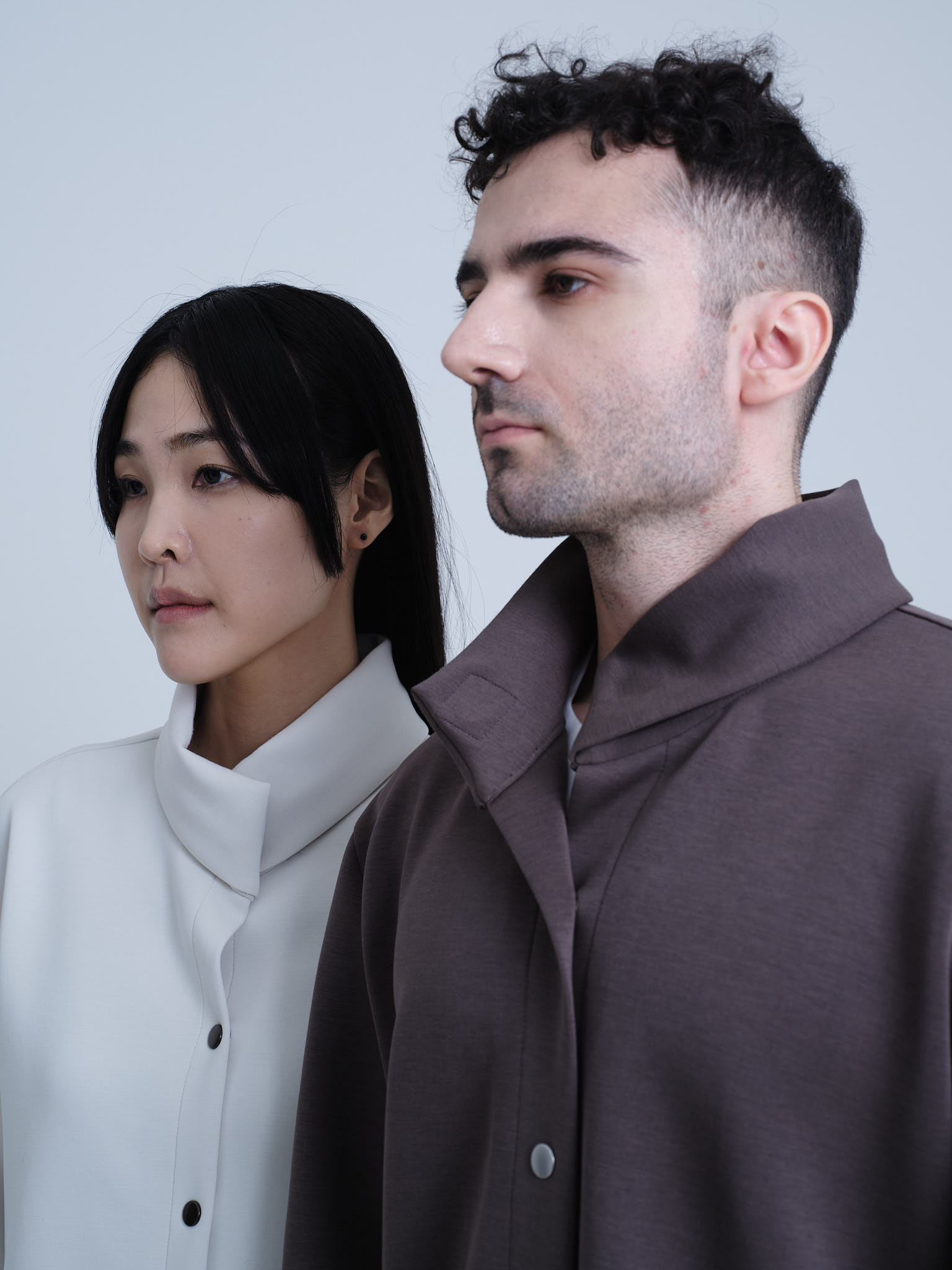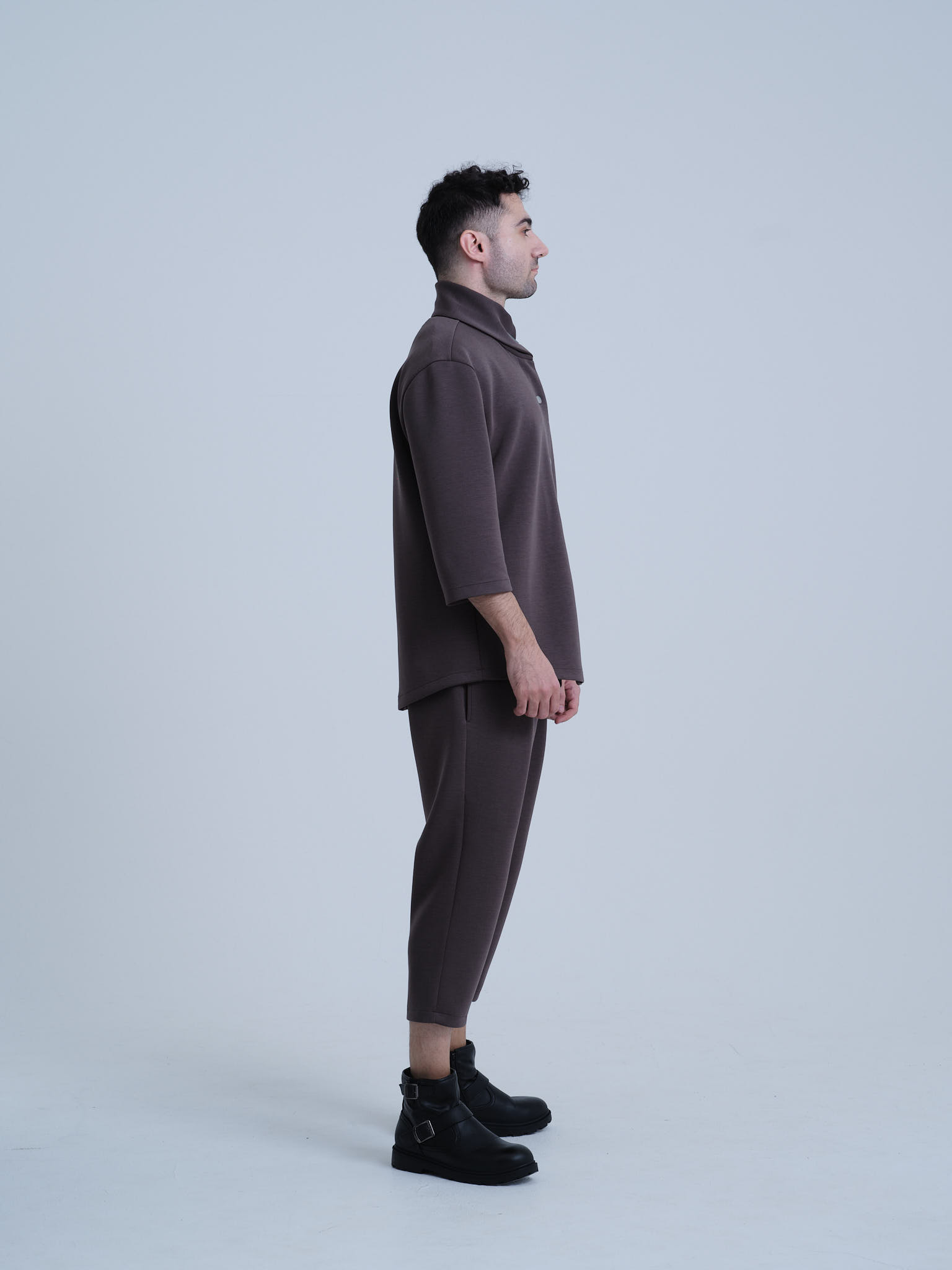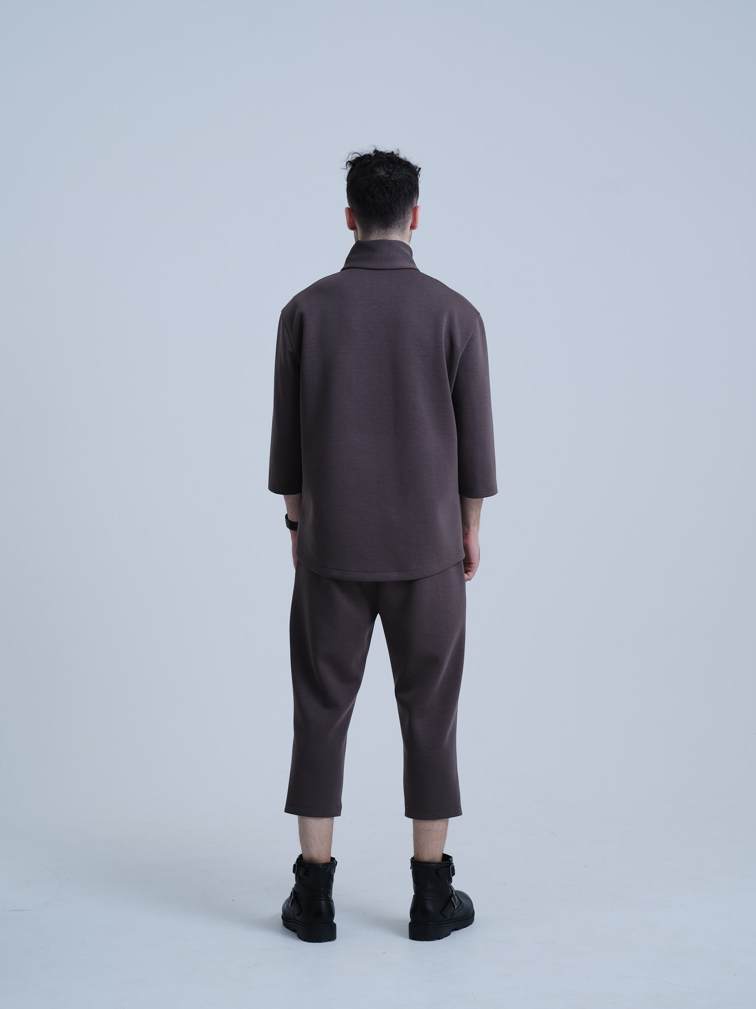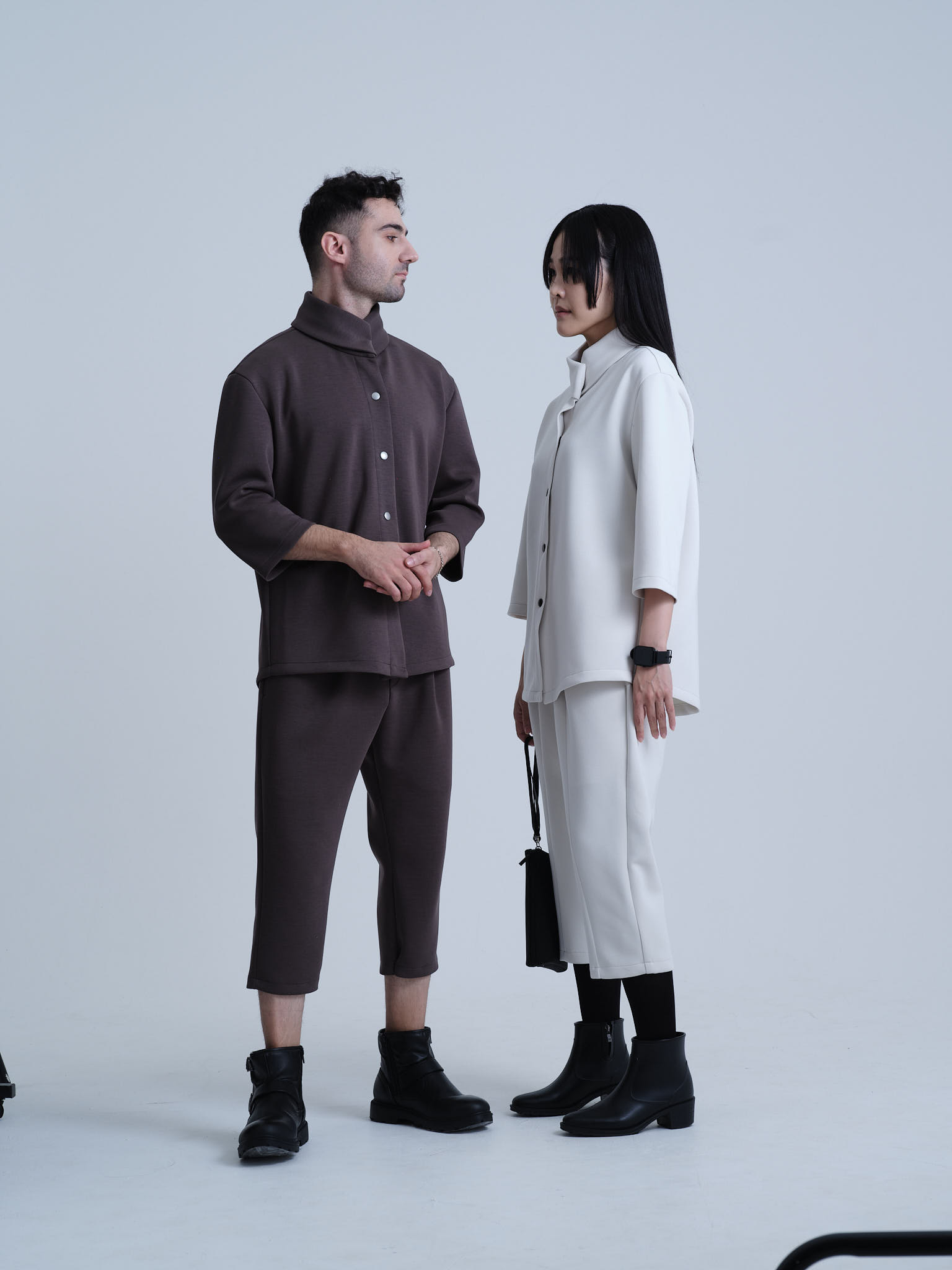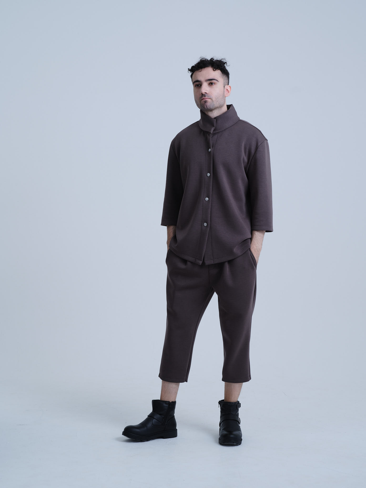 欧州のテーラリングと日本のミニマリズムを融合させた、クリエイターのためのハイブリッド・セットアップ。マグネットで瞬時に固定されるハイネックカーディガンと、自由な動きを可能にする半キュロット。オフィスから街へ。