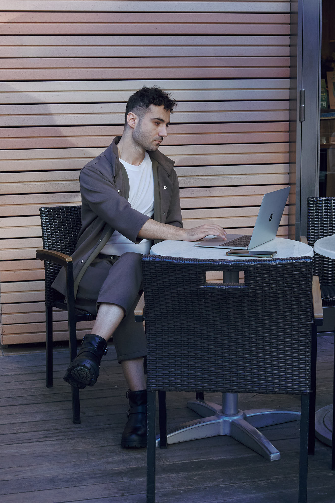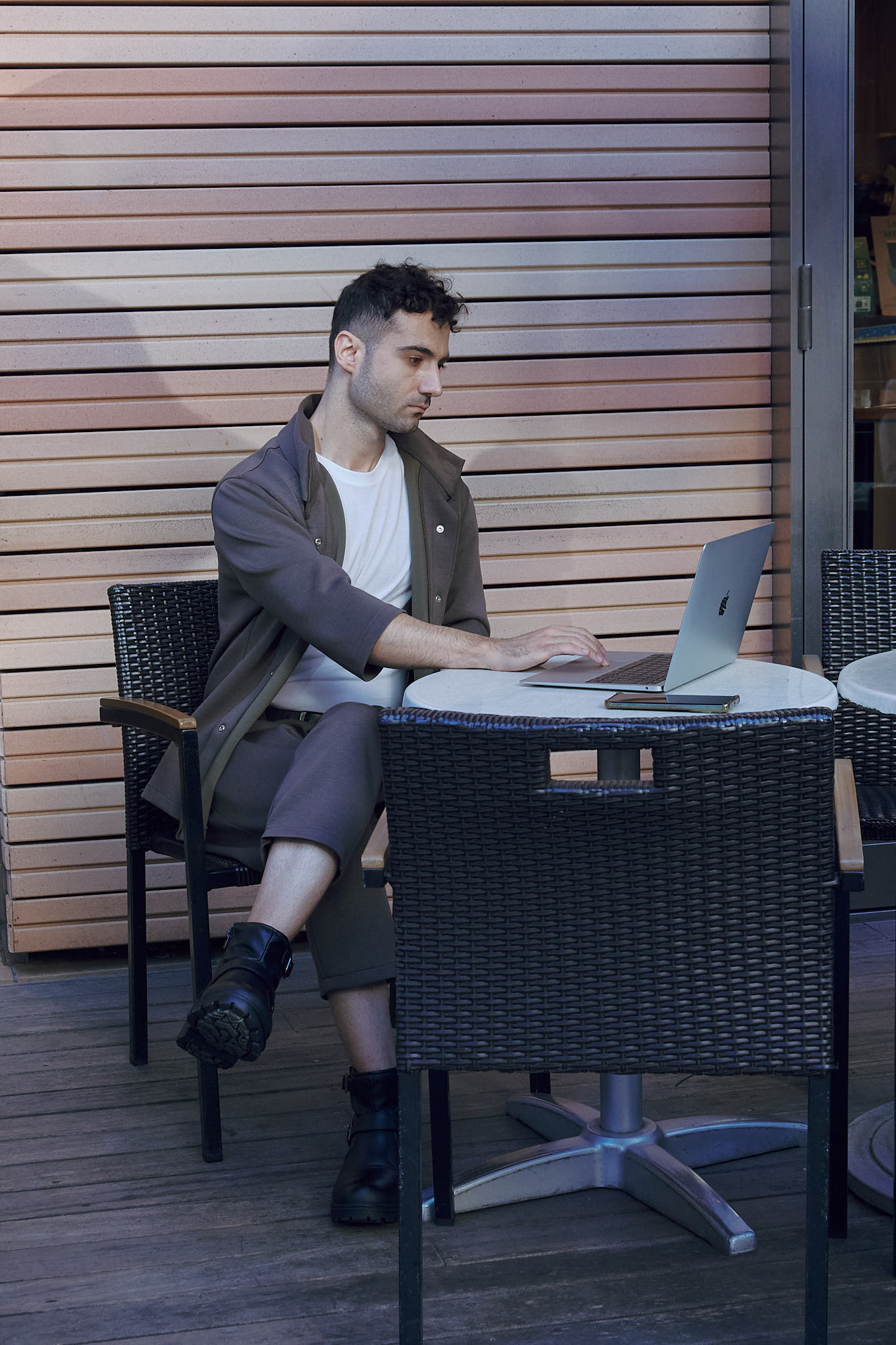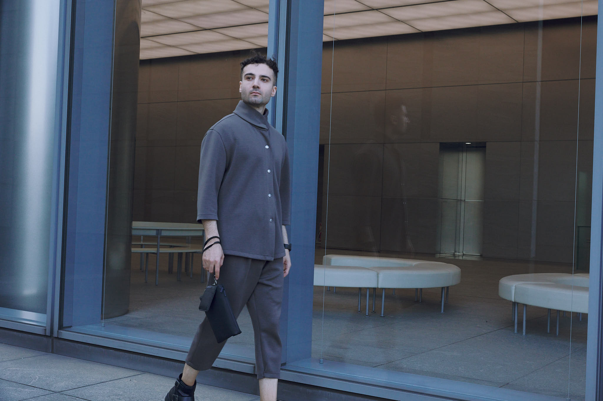 朝の空気の中で、動きに余白が生まれる。コンクリートのロビーを抜け、仕事へ向かう途中も、立ち止まってコーヒーを飲む時間も、同じリズムで過ごせる装い。整いすぎず、崩れすぎない。その中間にある状態を保つためのセットアップ。